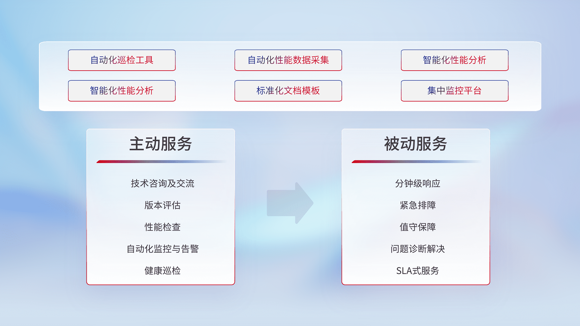 智能化工具和标准化文档,,保障服务质量,,提供主动服务(包含技术咨询、、、、版本评估、、、、性能检查、、、自动化监控与告警、、健康巡检)和被动服务包含(分钟级响应、、紧急排障、、值守保障、、问题诊断解决、、、SLA服务)。。。